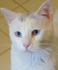 Luna is a beautiful all white Saimese mix kitten, with deep blue eyes, approximately 16 weeks old and weighs about 2.0 pounds. She's a sweetheart and a ball of energy, always enjoying new toys to play with (a simple ball and even a paper bag will be enough). Very curious and loves exploring. Excellent purrs and is often insistent on being petted and petted and petted. She enjoys playing and is in a home with dogs and cats. She's a love and very affectionate and you will enjoy watching her grow into an adult.