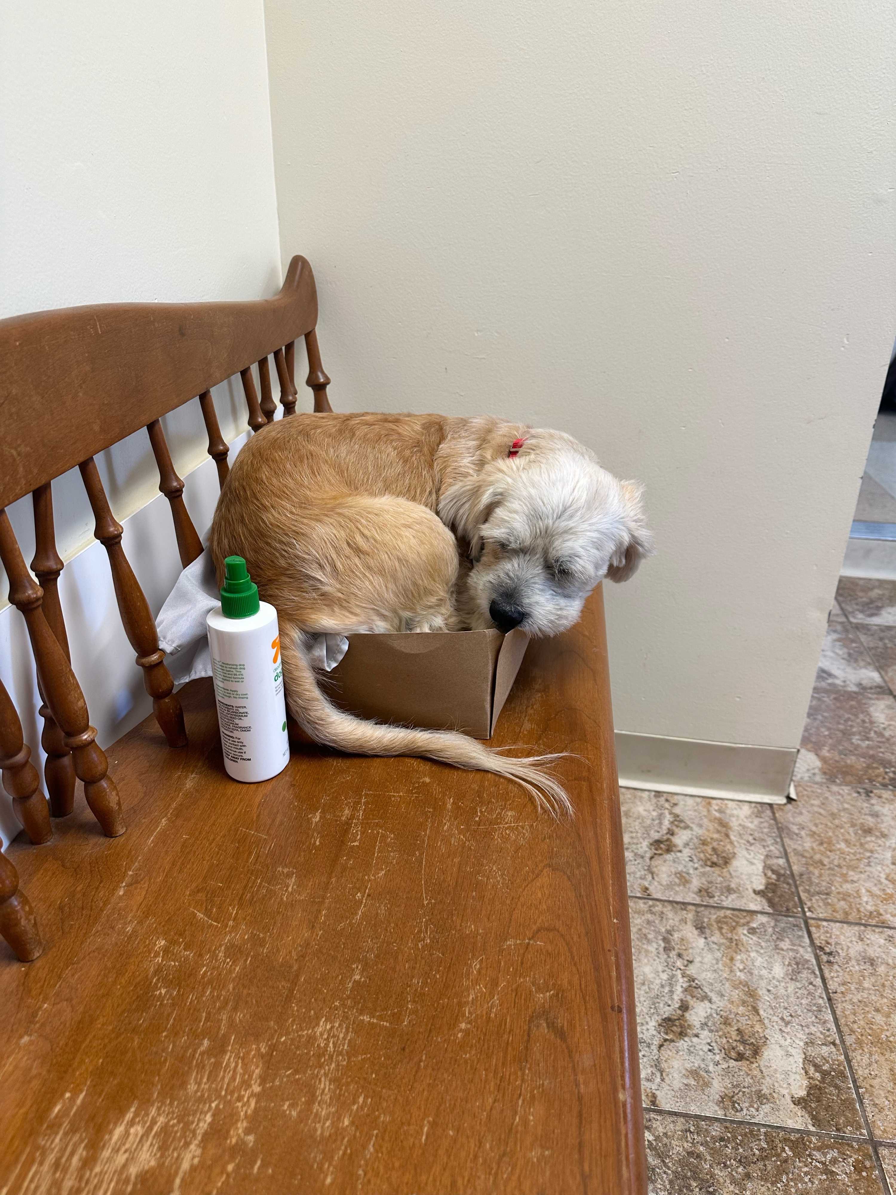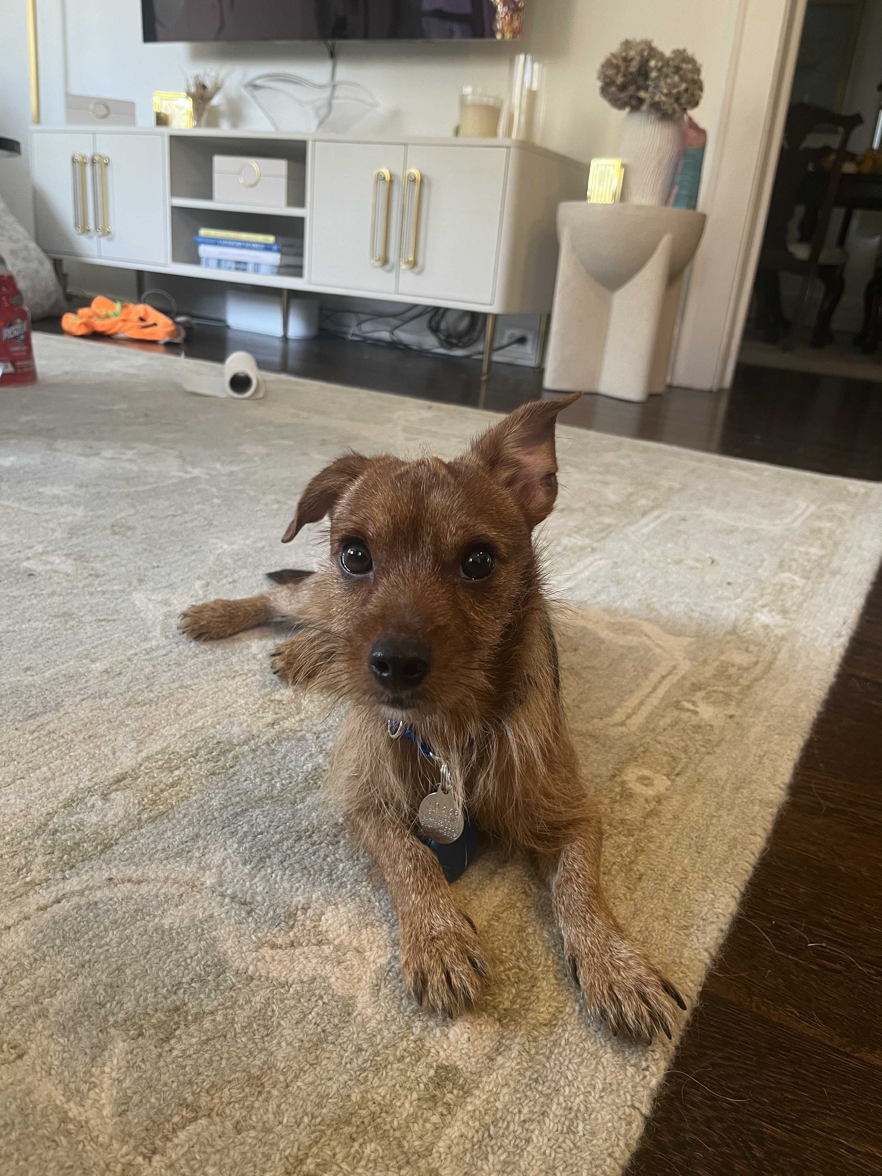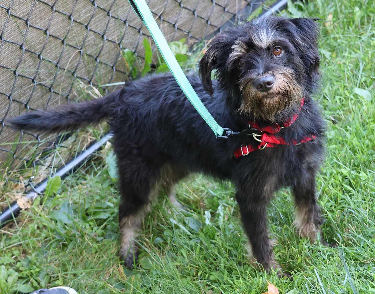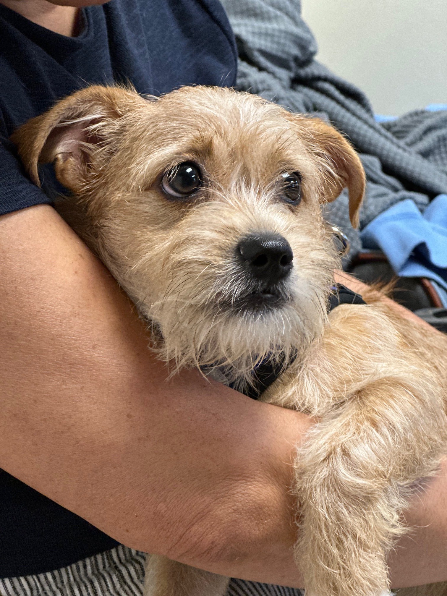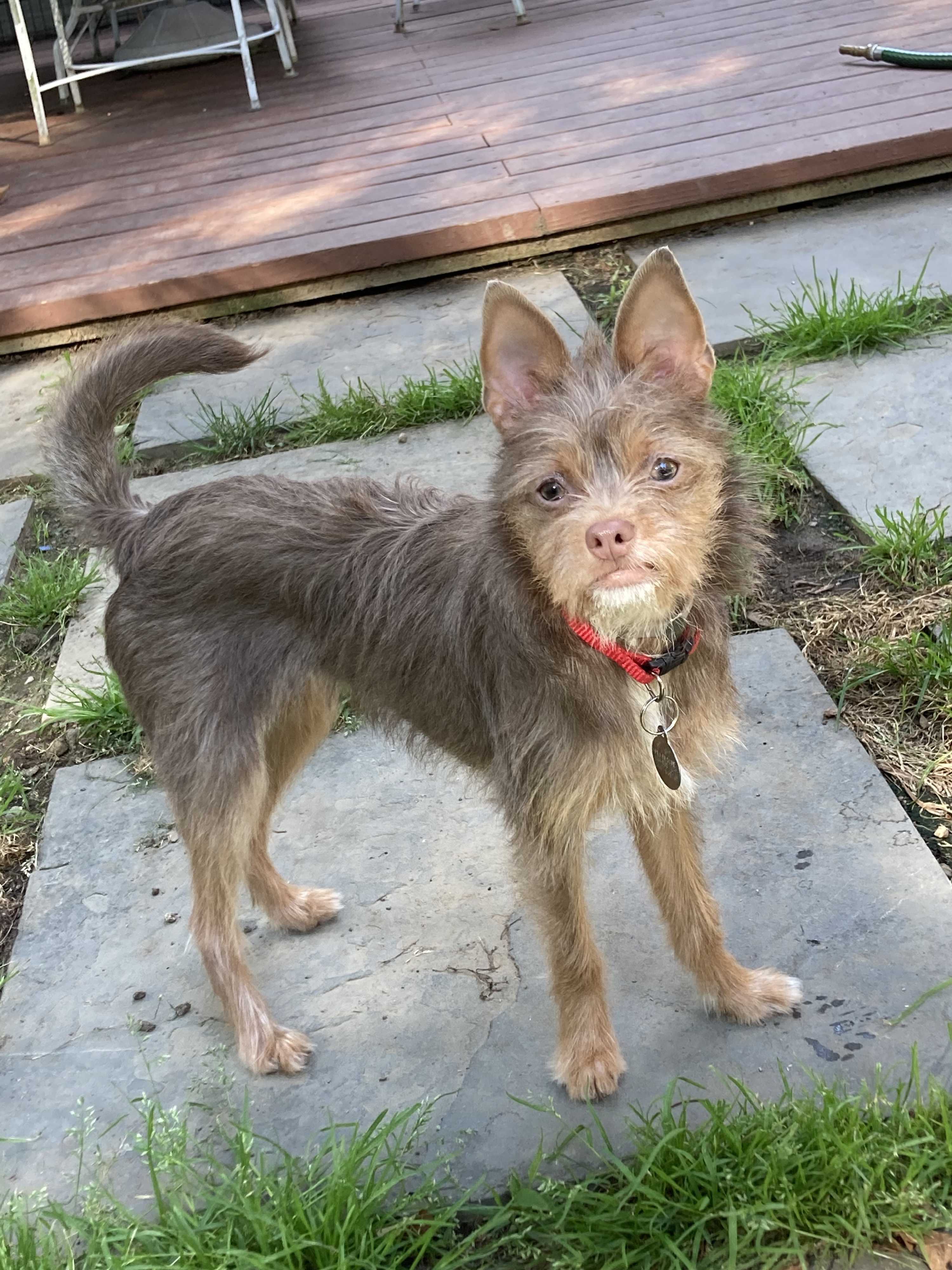 is a little wirehaired terrier mix, about a year old and 8 lbs. He will be groomed shortly but has beautiful reddish highlights. He is friendly, spunky and loves to give kisses. Just put him in your pocket and take him wherever you go! Thank you Elizabeth Genova for sponsoring my vet care!