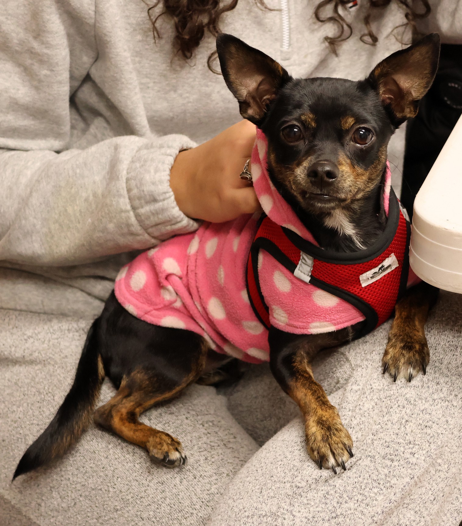 Lulu is a 10 month old chi mix and weighs about 6 lbs. She is very playful and loves her toys. She also loves to sit and snuggle. She is working on house training and leash walking. She is in a foster home with 2 other dogs and gets along with them. She loves women and is timid around men. She likes to be involved in the daily routine and is learning about her new environment each day.