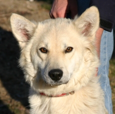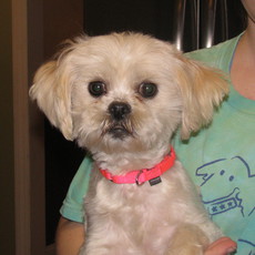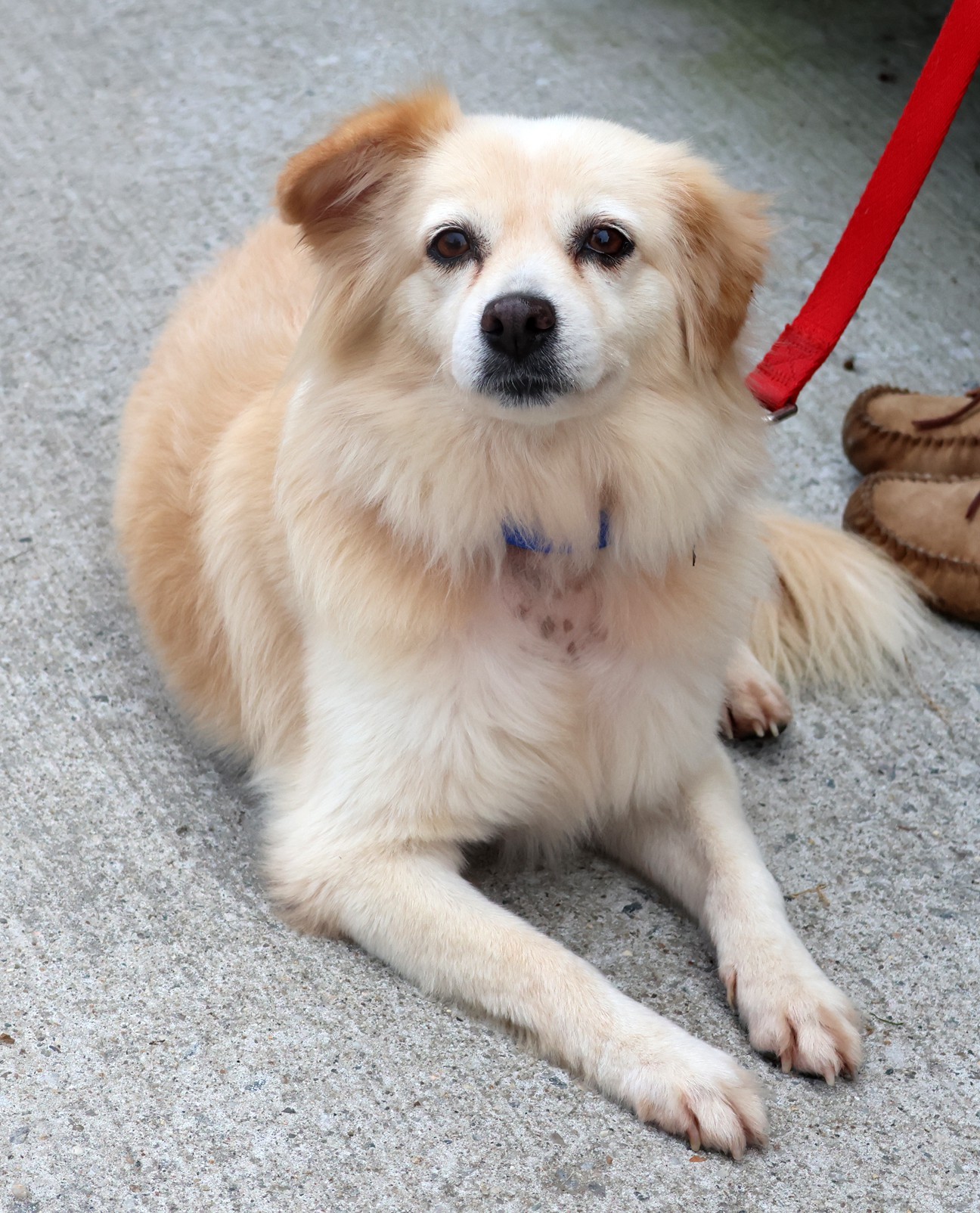 is a beautiful Pekingese rejected by a breeder because she is an albino. She is about 4 years old and 15 lbs. She is very, very sweet with sparkling blue eyes. This little girl walks nicely on leash without pulling and is very calm. At home, she is a couch potato and loves just cuddly up with her people. She will happily fall asleep in your arms. She can be a little dominant with other dogs but seems fine with cats.