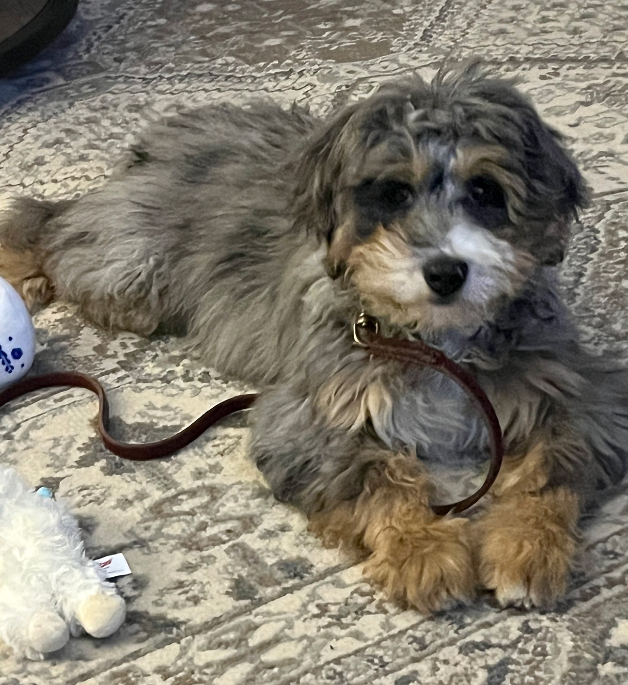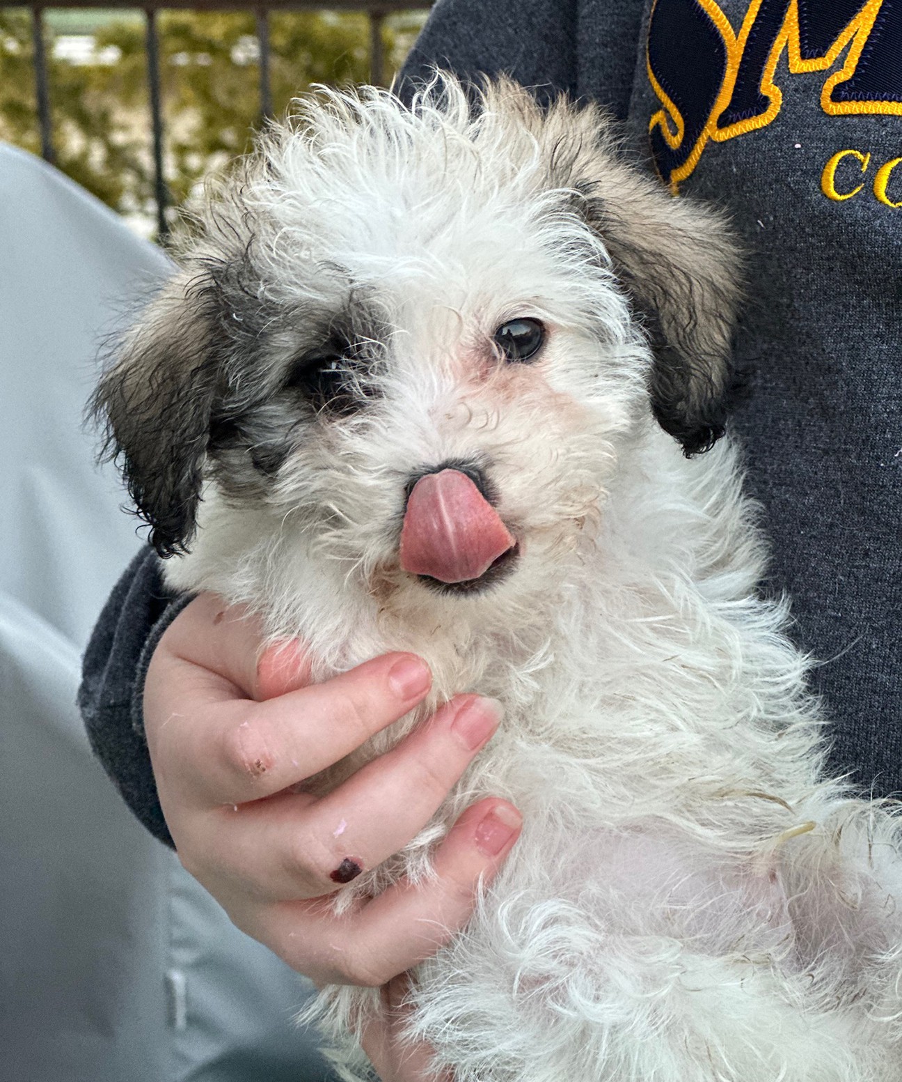 This adorable girl is a poodle/peke mix. She is about 14 weeks old and 6 lbs. She is playful, loves other dogs and is very adventurous. She loves to snuggle and will give lots of kisses too.