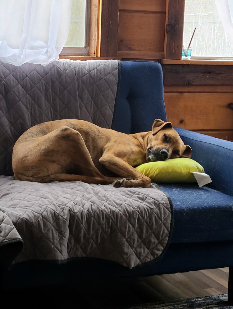 Luna is an adorable little bear, maybe Lab/Border Collie mix? She is about 2 years old and 50 lbs. She is super sweet, affectionate and greets her foster mom with lots of kisses. She loves to sit and watch TV with you. She is friendly with other dogs and cats, loves swimming, is playful but not pushy and is housebroken too. She is happy to meet new people but would prefer to live in an all-female household as she gets uneasy living with men. Luna is a very special girl and her big brown eyes will melt your heart. Click here to see a video of Luna.