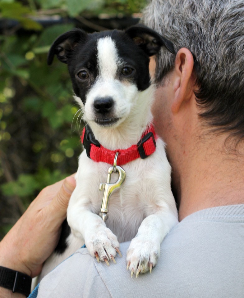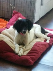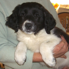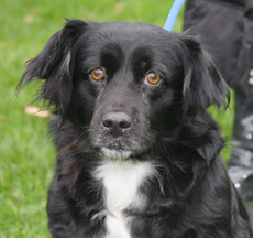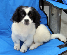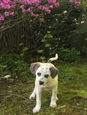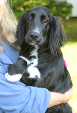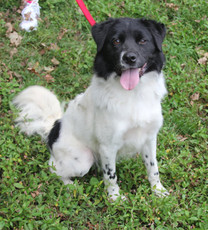 is 26 lbs of love and affection! This spaniel mix is about 6-8 months old and sweet as can be. She is friendly with people and other dogs. She is cuddly and loves to give kisses. Her coat is like a flat coated retriever and she has black spots on her white paws and the tip of her tail. She is just gorgeous! She is playful -- loves her toys and likes to play fetch or chase other dogs -- yet is mild mannered. Her foster mom has been taking her out regularly and she seems to be housebroken. An all-around great dog! Thank you Amy Guadagno for sponsoring my ticket to freedom!