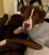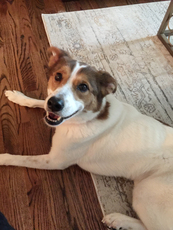 Luke is a goofy pit bull mix about 16 months old, weighing in at 57 lbs. He has very cool, gorgeous bovine markings and a great big smile on his handsome face and is sure to put one on yours as well. He is extremely social and loves the hustle and bustle of grandchildren and friends and neighbors coming in and out of the busy household. Everyone he meets is his new special friend. He loves to play and snuggle with his foster doggie siblings and enjoys hanging out with his people after a busy day. He is very smart, knows how to sit, and comes eagerly when he's called. He is friendly with strangers, dogs he's just met and even the cats. He walks well on the leash and is crate trained, sleeping through the night. He is super affectionate and simply melts when you rub him around his ears or give him a good butt scratch. He is good natured and has a happy-go-lucky personality. He's an all-round perfect pet!