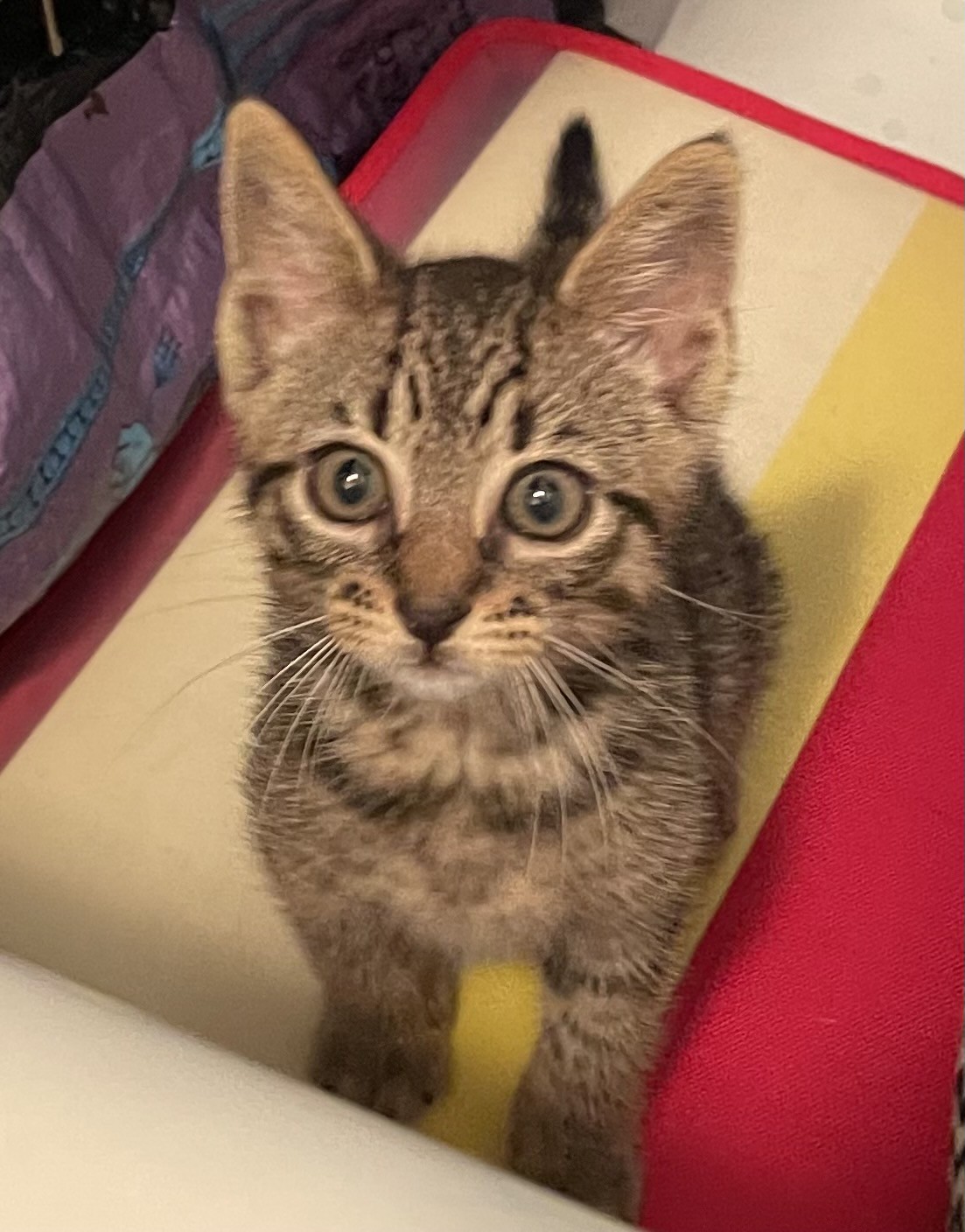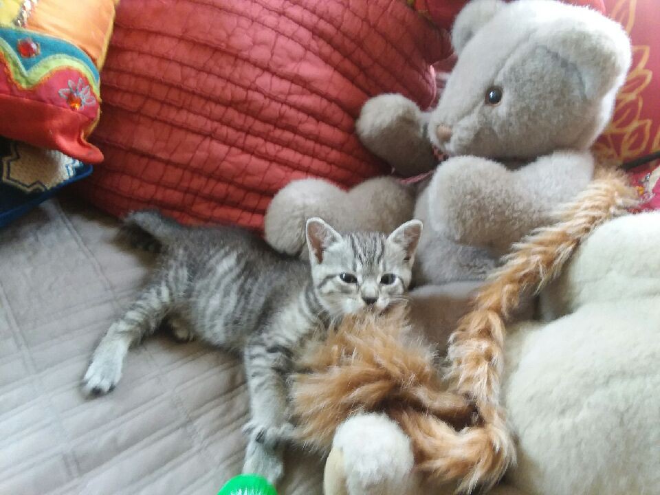 This is an adorable little kitten that loves to play and snuggle up in your lap when time allows it. Very sweet and outgoing. She purrs like a motor and plays like there is no tomorrow.