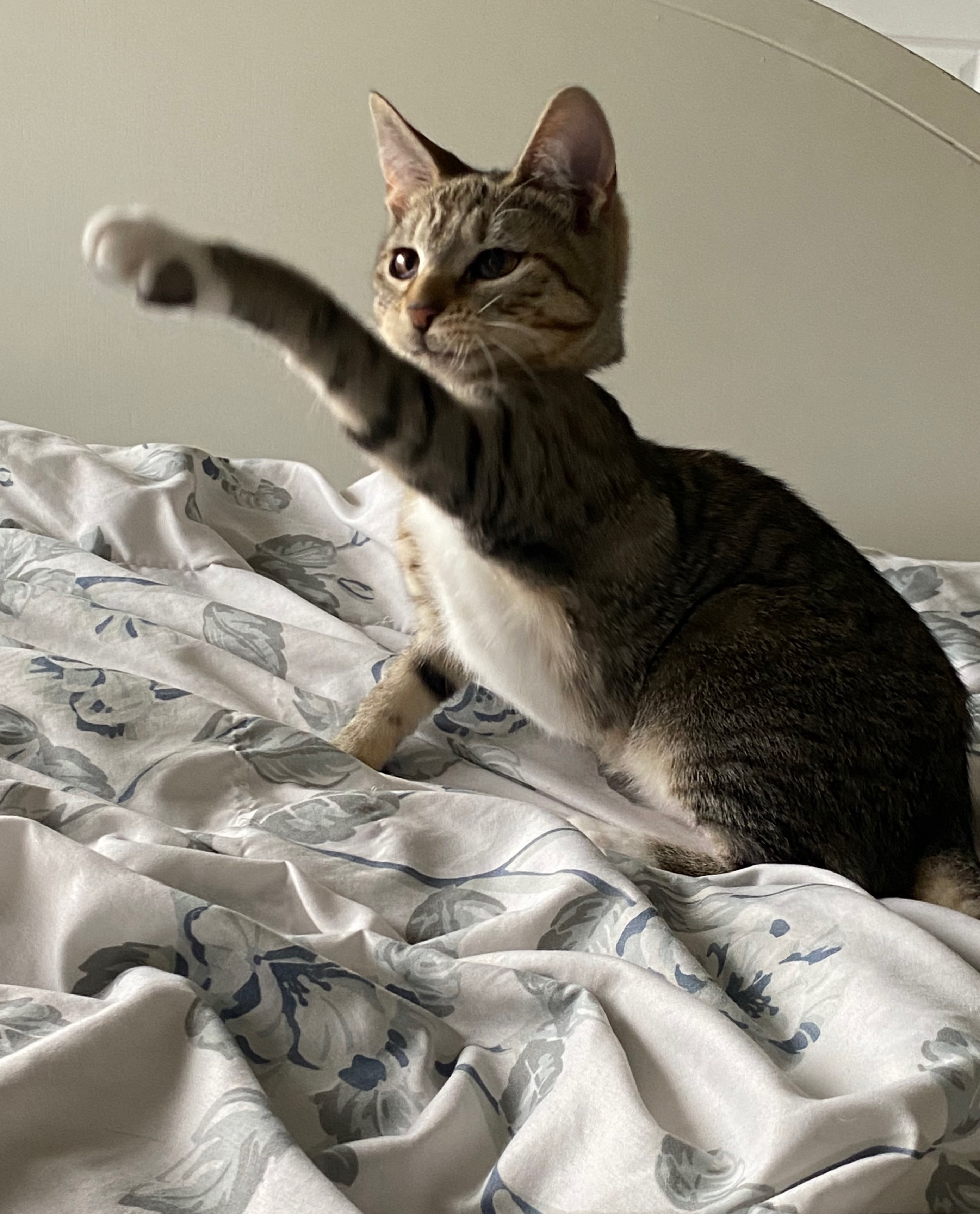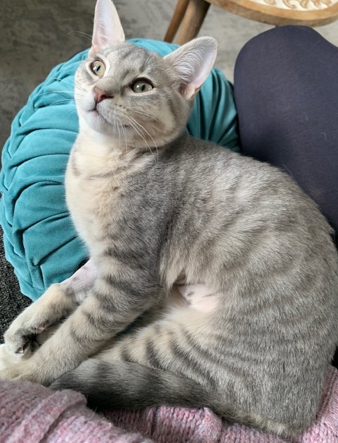 Malachi is a cute "tiger" male, sibling to Salome and Dev, also featured on this website. Born on May 3, 2019, Malachi is a darling little love who is quick to purr! He and his siblings love their kitty climber, toys with feathers and gentle back scratches (ks).