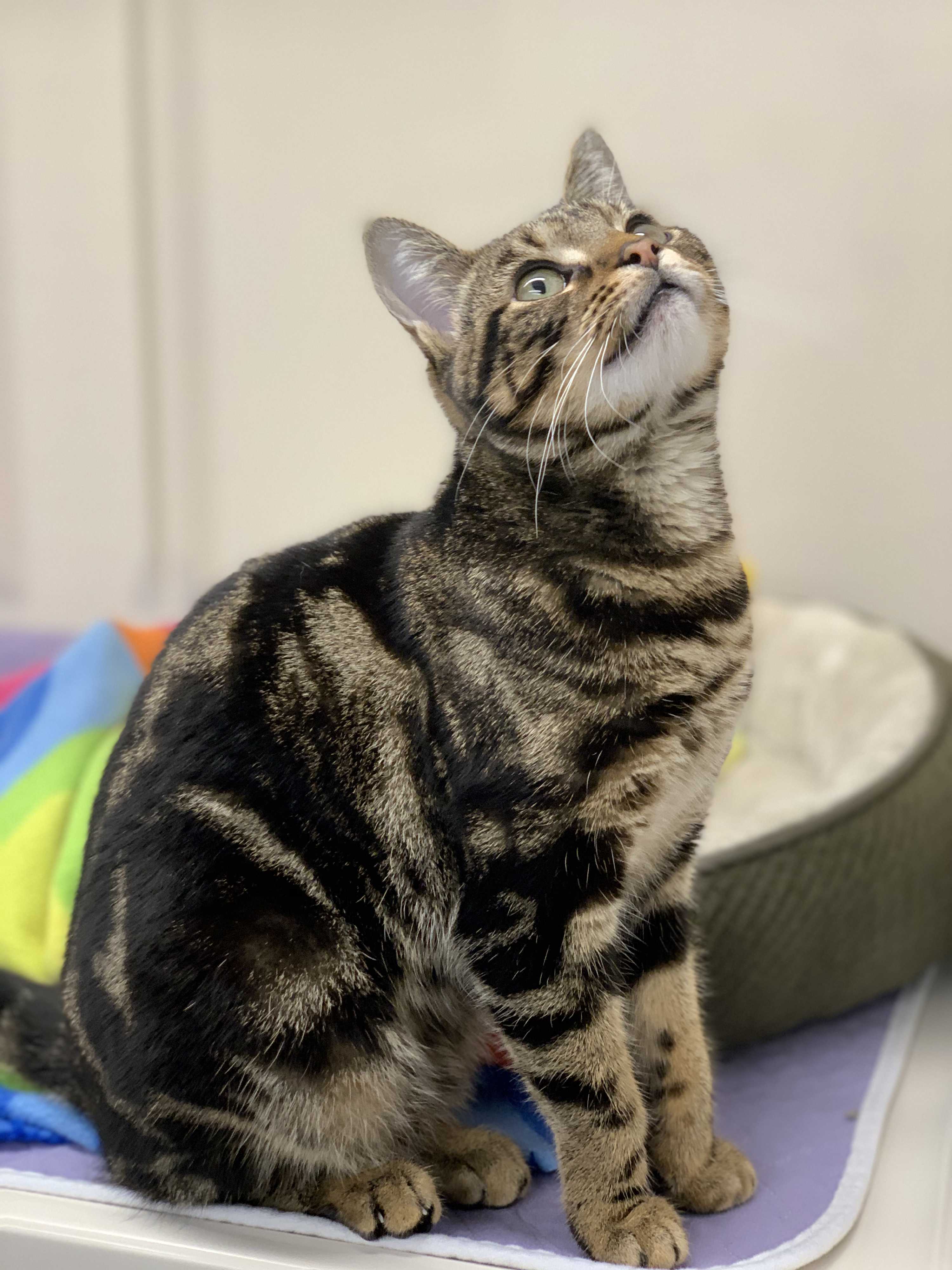 Born July 2020 The award for best whiskers goes to...Mr. Bingley. This handsome tabby has character to spare. He's a big boy with a big purr and a lot of love to give. Mr. Bingley has an easy going personality. He likes to explore, lounge, eat and repeat. He's not a talker but he's good company all the same. Mr. Bingley enjoys pets and will encourage you with a good nudge if you stop too soon. He's comfortable with other mellow feline friends but shys away from alpha cats.