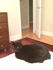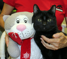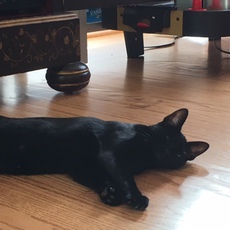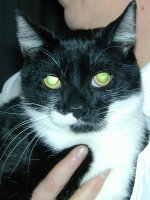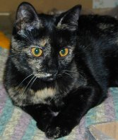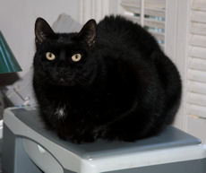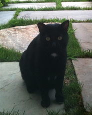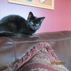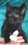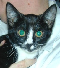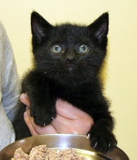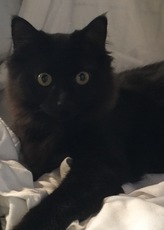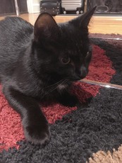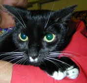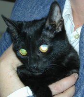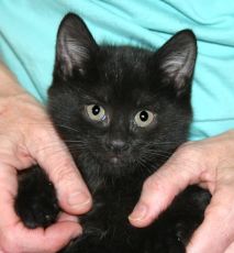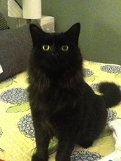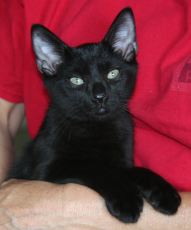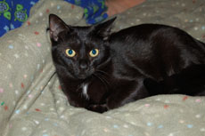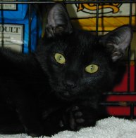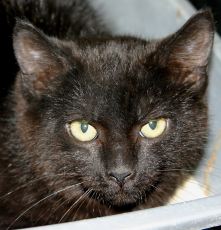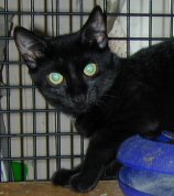 Mr. Magic, a beautiful shiny black 1 year old with big gold eyes. He's a shoo-in as a pet - he's very loving. He purrs on cue. You just have to pick him up. Gets along well with other cats.