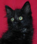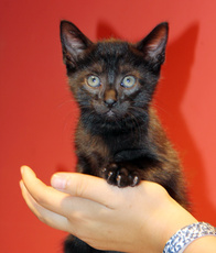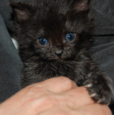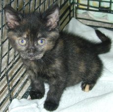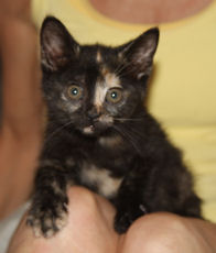 M&M is an adorable medium-hair female kitten, about 7 weeks old. She's all black with a little splotch of white on the tip of her tail. She is friendly, playful and too cute!
