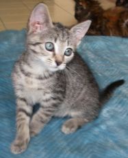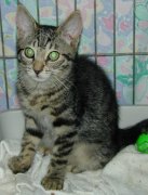 Maggie is one of Judy's wonderful tabby kittens, who reside in her foster home. Born in mid-April, 2014, Maggie (sibling to Miley and Manny) is exceptionally affectionate (as are all her siblings), loves to be held and petted - a real snuggler. Like her siblings, Maggie suffered early from an eye affection that has been treated by a vet eye specialist. Her sight is good, but she does show one "cloudy" eye. But once you pick up this sweetheart and hold her tight and rub her belly, you will only think what a special kitten this is and just want to take her home. Maggie and all her siblings are dog friendly and get along well with other cats.