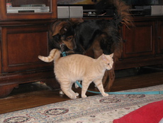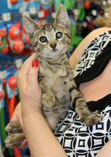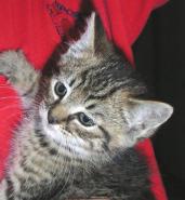 Magoo is an explorer! He'll check out every nook and cranny in the house and everyone who lives there. He gets along well with other cats and currently investigates dogs by tapping their tails; he hasn't formed an opinion yet. Chuckie loves running games with his litter mates and capturing toys - he's lightening fast. Magoo (and his litter mates, Priscilla & Chip) were born in early May.