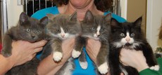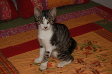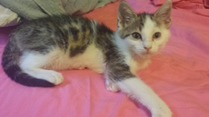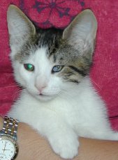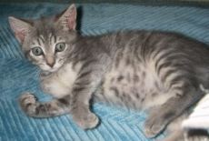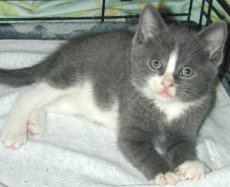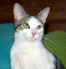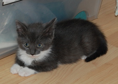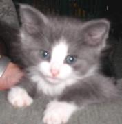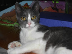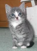 Maddie is an adorable little grey and white female kittie, sister to Nibbles and Jezabel, also featured on our website. With her siblings and her Mom, Mia, Maddie lives in a foster home where she receives wonderful care. She is very friendly and loves people. All Maddie needs now is a permanent loving home. Born in late May, 2011, Maddie is about 8 weeks old now.