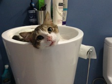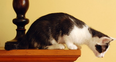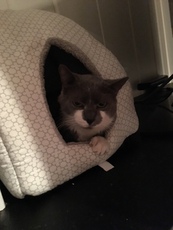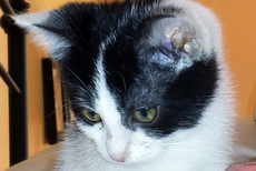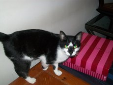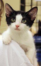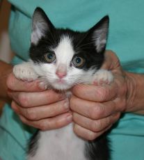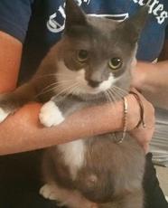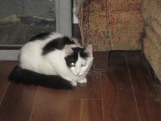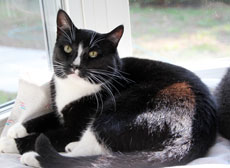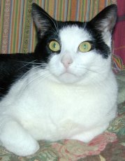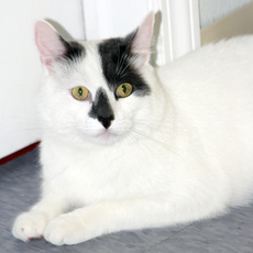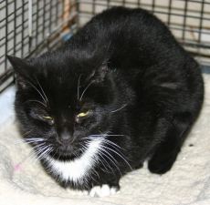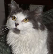Mr. Chips, a black male with lots of white has a beautiful big head. He is loving and playful after just a little time for getting acquainted. He loves to be petted and if given the opportunity, will be lap warmer or bed warmer. We think he would be best as an only cat.