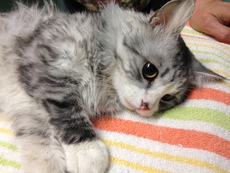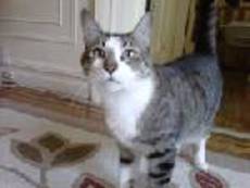 Monkey is a striking silver and white tabby male, approx. 3 years old. Very gentle and sweet, Monkey was rescued from the street with a leg wound which has since been treated and has healed. He is in great health now and up to date with all vaccinations.