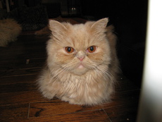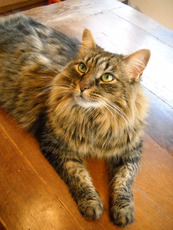 is under two years old and with her beautiful long coat and perfectly symmetrical face looks like a primadonna but she doesn’t behave like one. She is affectionate, loves to sit on a lap and sometimes favors one with a gentle lick. Making herself busy for a good part of the day she chases a ball and explores other toys and interesting objects. She is clean and in all ways a perfect pet. Now living with other cats, she gets along with them but we feel she would be just as happy as a lone pet. Her personality is big enough to fill a home. Mrs. Muir is a polydactyl and has 7 toes on each paw.