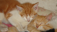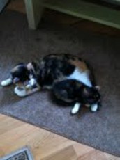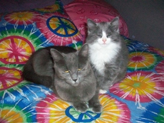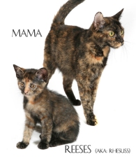 Beautiful Mama cat with her sweet look-alike kitten, Reeses would love to find a home together. Reeses was born on 8.10.07. Mama is a good mother and just as sweet as can be. Reeses is as playful and happy as any kitten could be. They've been around large dogs and are fine with them. Mama seems to love the dogs and rubs against them any chance she gets. Both are wonderful, social and loving kitties!