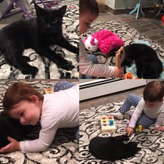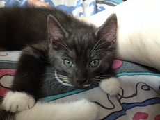 These inseparable brothers (about 5 months old as of 3/6/17) were found abandoned in a vacant lot at around 2-3 months old. In foster care, Squirrel (grey) and Mouse (black) evolved from terrified of their own shadows to love bugs. They may be shy at first, but with gentle affection, they will be inseparable from you. They will wiggle and writhe with happiness when their tummies are rubbed. These cats are very gentle. If scared, they may hiss but they do not bite or scratch. They have been raised in a home with multiple cats and children, so they can thrive in either a busy or quiet home. Even as older kittens they still sleep and play together constantly, and we ask that they be adopted together.