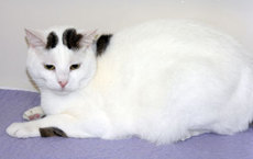 Mackenzie is a semi long hair female, about 1 year old and primarily white with black splotches and tail. She has a very distinctive look. She was rescued from a hoarding situation and now resides in a foster home where she gets along with other cats, dogs and children. She is very friendly and a real joy to be around.