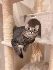 Born January 2022 Mousie is a quiet girl with a soft purr. She likes to take her time getting to know you but after that you have a friend for life. Mousie enjoys observing her surroundings from any perch or window available. Don't be surprised if you find her sprawled on her back asleep in a ray of sun. She does enjoys playing and can catch any toy. Mousie would do best in a home without small children or dogs.