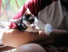 Ready to play? Magoo is! He enjoys "skiing" down a stack of bed pillows, romping in the laundry basket (clothespins are a plus!) wrestling with his brother, Chip, or playing any number of games he invents. Once he tires out, he'll purr like a train when you stroke his head or cuddle him on your lap. Magoo is very bonded with his brother, Chip, who is also available for adoption. Magoo was born in early May. He likes other cats and can coexist peacefully with a dog.