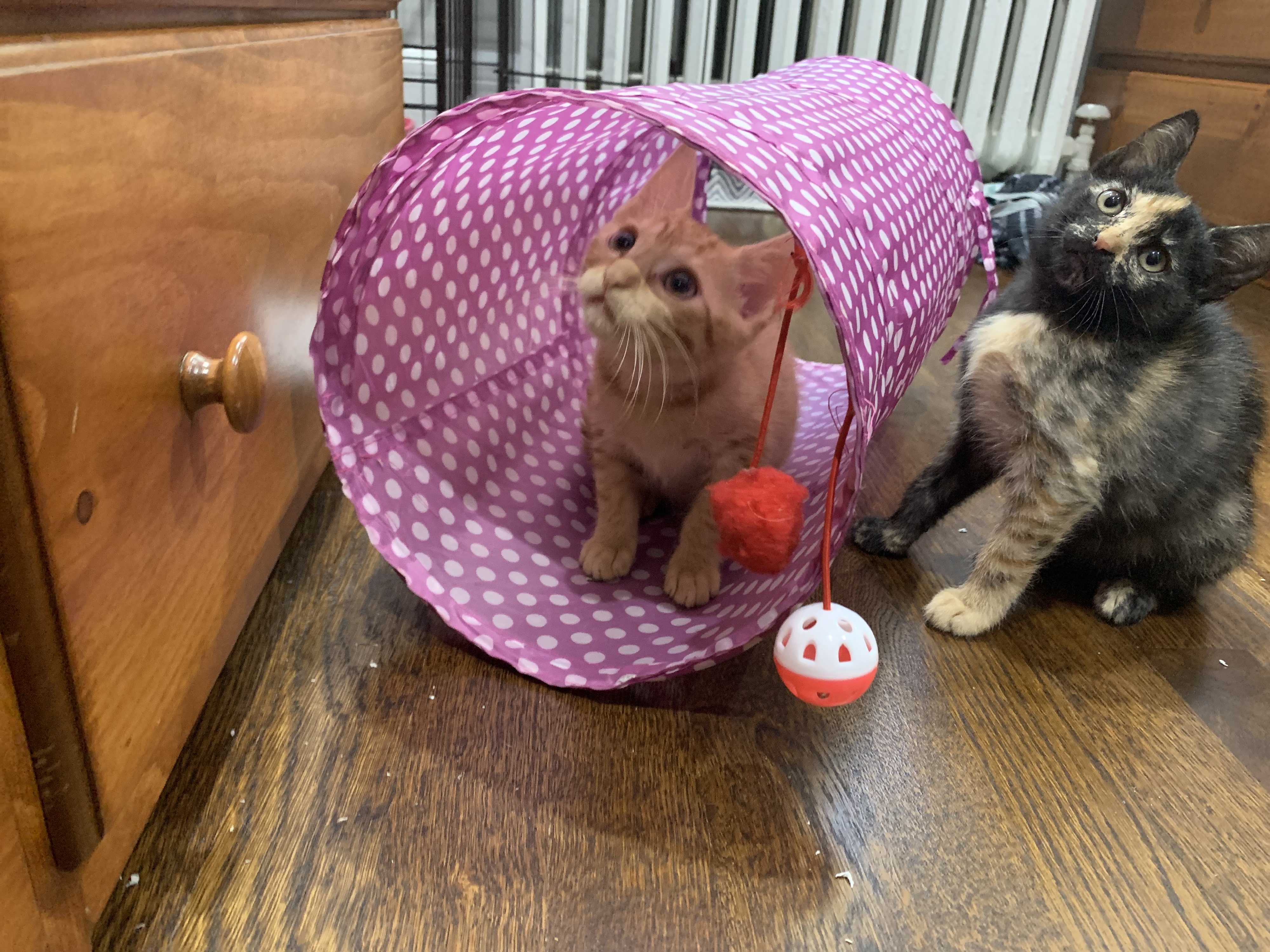 Nike (orange tabby) is the sweetest, most playful kitten! He loves to spend his day playing and will greet you every day with purrs and affection. This 8 week old (as of 9/16/19) kitten is a sibling to Sandal, also featured on this webiste. Nike is a purrfect companion and is great with other cats! EP