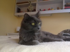 Sweet and demure, Natasha is a beautiful 6-month old Russian Blue mix. She has a soft, luxurious coat and big gold eyes.