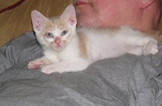 This cute little boy is kind of fuzzy. He is only about 6 weeks old and will need to be in a home with another kitten.