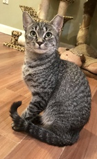 Born June 2021 This striking grey tabby boy is well mannered and friendly. Nigel typically walks around with his tail straight up in the air, a sure sign of happiness. Just in case there are any doubts, his tail starts to vibrate as soon as he receives attention and pets. Nigel is playful but not high energy. He is the perfect balance of a fun friend and calm companion. Nigel is comfortable around other cats but dog owners need not apply.