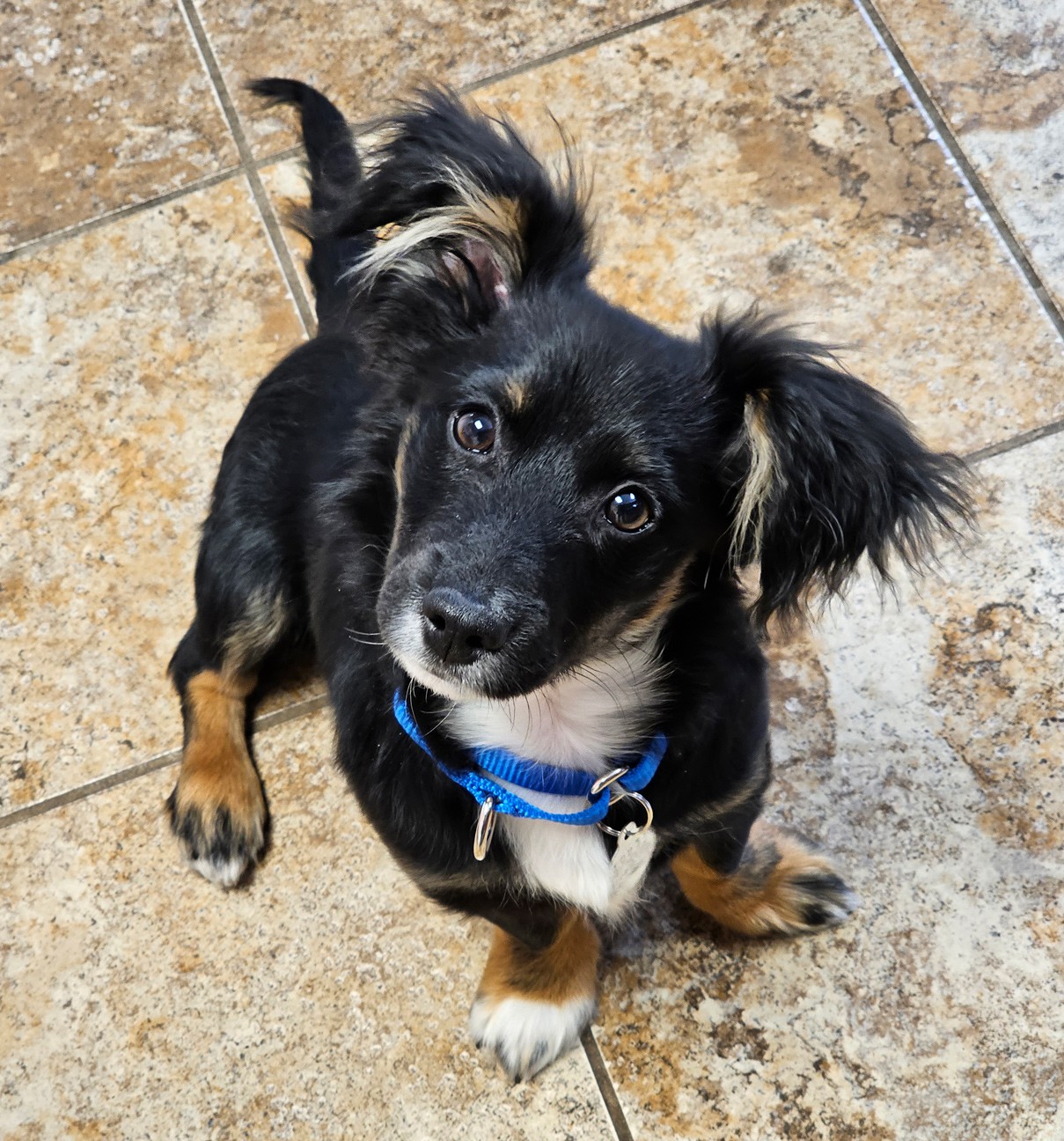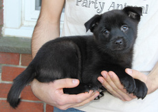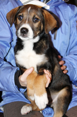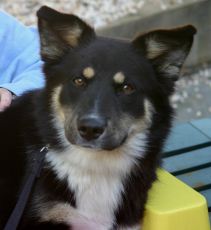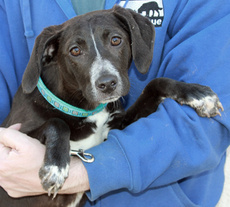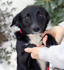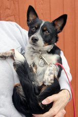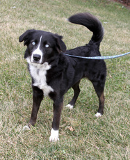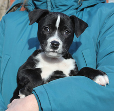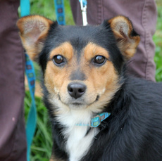 Nancy, the sweetest little 17 lb., 15 week old, border collie mix is just the greatest pup to have around. She loves people and is beside herself with joy when her foster family snuggles her up with attention; and oh, what a feeling to walk into a room and be greeted by this little girl with tail wagging in excitement! She has a blast playing with the dogs in her foster home, both large and small, wrestling and playing chase with the cutest enthusiasm. Of course, Nancy can also be found quietly chewing on or batting around a dog toy and is even learning to retrieve and bring back the ball. This babe, who is crate trained is also well on her way in housebreaking and leash walking. Her look is unique as are her beautiful markings...black coat with brown undertones, white speckled legs and ears that can't decide if they want to stand up or flop half way. In fact, Nancy is an all around special puppy with a happy temperament who deserves a home that will promote and cherish this. Would you like to be the lucky home that adopts her? Click here to watch a video of Nancy