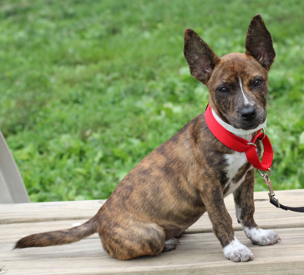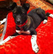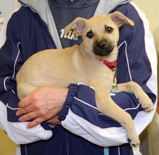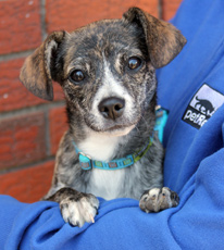 OK, other than being super adorable, we really have no idea what breed Nora is. She's simply one of the cutest, most interesting looking puppies we've ever seen! Nora gets along well with dogs and people of all ages, shapes and sizes (she's not been with any cats). Because Nora's still teething and a little nippy, we recommend kids over the age of 7 who can understand and handle puppy antics (pick up those toys, kids!). She loves her toys and her food, but most of all she loves people! Nora is not quite house trained (but trying!) and is getting used to a leash. She sleeps in the crate at night. If you want cute and fun, Nora is the ONE!