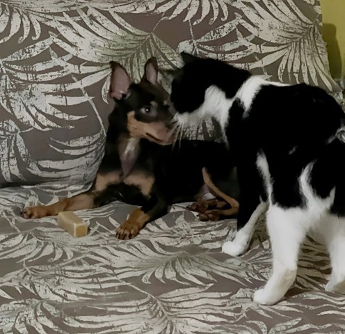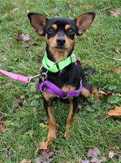 Nora is an adorable min pin mix, about 8 months old and 8 lbs. She is a little shy at first but warms up quickly. She plays with all size dogs now with much confidence and agility! The pictures do not do her justice....