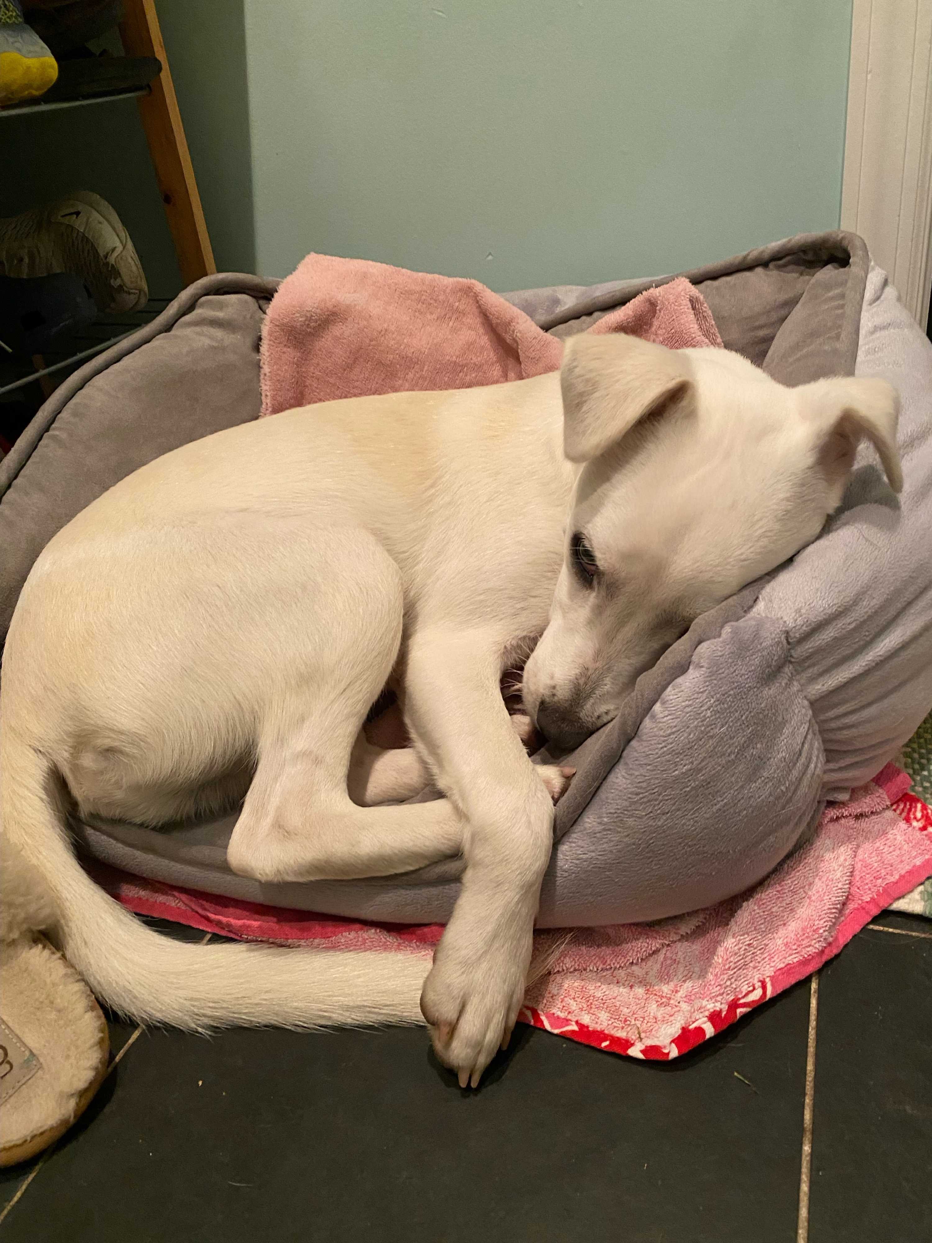 Noli is a beautiful 7 month old, white Lab Mix, and weighs 31 pounds. She has a bouncy personality and is curious and outgoing to all. Noli loves to explore and be outdoors running and playing with other dogs. But that doesn't mean that she doesn't snuggle. She also loves quiet time, an available lap and a good cuddle. Noli will thrive in a home with adults and older children. Come meet beautiful Noli and fall in love. If you are interested in this dog, please submit an application directly to our website at www.ny-petrescue.org Only applications submitted directly to Pet Rescue will be considered.