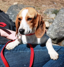 Wouldn't you like to canoodle with Noodles? Noodles is a female beagle about 14 lbs and 1 to 2 years young. She is a very sweet dog.Noodles immediately took to her foster dog sibling, giving him kisses as soon as she saw him. She also loves people (including kids) and gives everybody kisses who asks for them. One of her favorite pastimes is to cuddle up and take naps with her foster mom and dad. She's learning to walk on leash but still needs basic training. She's working on her housebreaking skills - almost there! She has not been tested on cats.