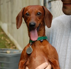 Noodles is an incredibly sweet 1 year old 12 lb dachshund. He is a beautiful rusty color, and has these big brown eyes that just scream out "love me." Noodles is great with cats, kids and other dogs. He takes treats very gently and aims to please. Noodles is now housebroken when kept on a schedule, and we are working with him on pulling less on the leash. He responds very well to gentle corrections and is treat motivated. He sleeps through the night in his crate, and will even go in it during the day if he needs a break. He loves to snuggle and will take a nap while you're watching tv or doing emails. Inside he is a medium energy dog, but since he's so small a few games of fetch tire him out quickly. He is ok when left alone for a few hours, but is happiest when he's with people. Noodles would make a great addition for anyone looking for a snuggle!