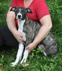 Nutmeg is an adorable greyhound/lab mix puppy. She is 6 months old and 25lbs of puppy love. If Nutmeg was a little girl, she would be the sweetest. Constant kisses is what you can expect from her. She is eager to please. She can be a little shy at first but is quickly warming up to life in her new, loud, foster home! She is wonderful with other dogs, great with kids and doesn't mind the cats. Actually, she may even be a little scared of them. She is working on housebreaking and LOVES to eat! Her sister, Cinnamon is in another family member's foster care, so they still love to play together. Click here to watch a video of Nutmeg.