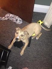is little over a year old and weighs 65 lbs. She is very sweet and just loves to play! Good with kids and other dogs and would thrive in a home that had one or the other or both. She is being giving up by a family that is separating. Nyla has never had a backyard to play in and really needs a place where she can run around. Nyla is housebroken. Please submit your application.