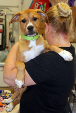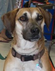 This sweet little girl is about 6-7 months old and around 34 lbs. is the most lovable of dogs. She loves to give kisses and hugs and just be near you. She gets along great with other dogs, cats, kids, and adults. She loves to sleep curled up next to her favorite person and will sleep until you wake her up. Natasha appears to be housebroken and is good on a leash. She comes when called and is learning simple commands. Natasha will make an active family very happy.