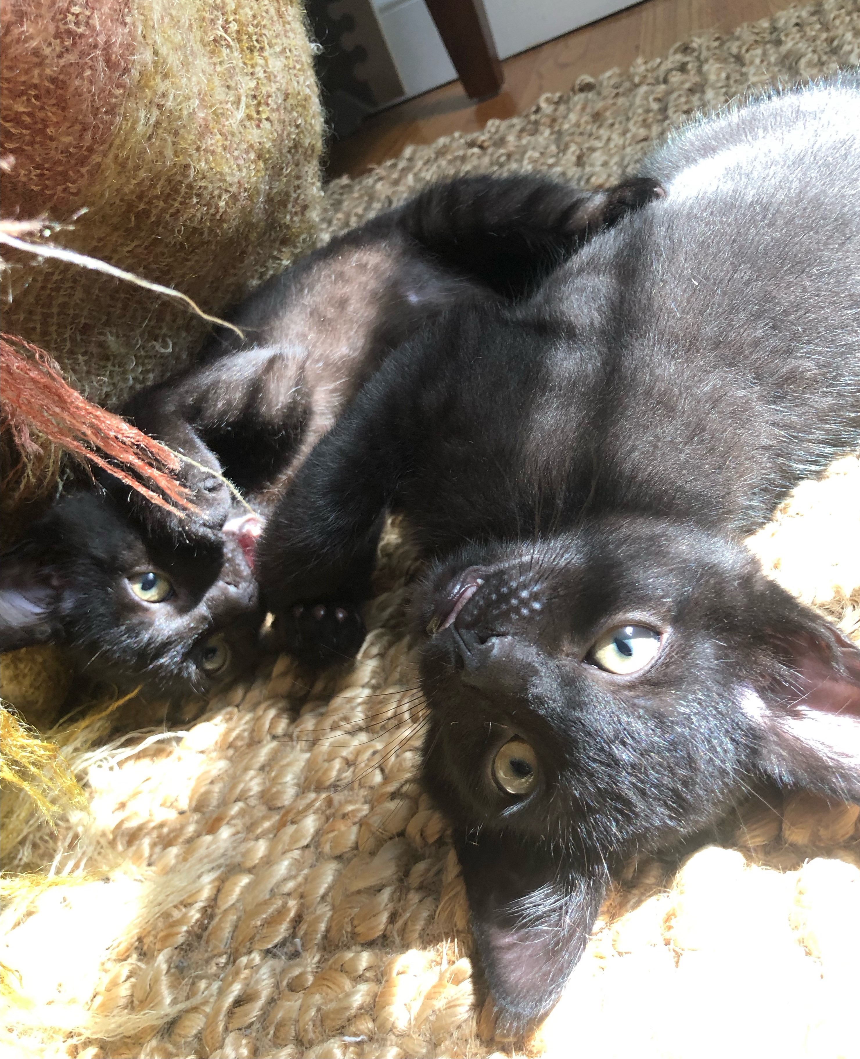 Date of Birth - 4/26/23 What’s better than one black kitten? Two black kittens! Orion (male) plays and cares for his sister Pandora (female) all day long. Pandora relies on Orion for comfort and security. They are very playful and the perfect duo. They love spending time getting to know their foster feline siblings. They prefer older human siblings or younger children that are part of an experienced cat family. Pandora is the quieter one but all she needs is love and patience to come out of her shell.