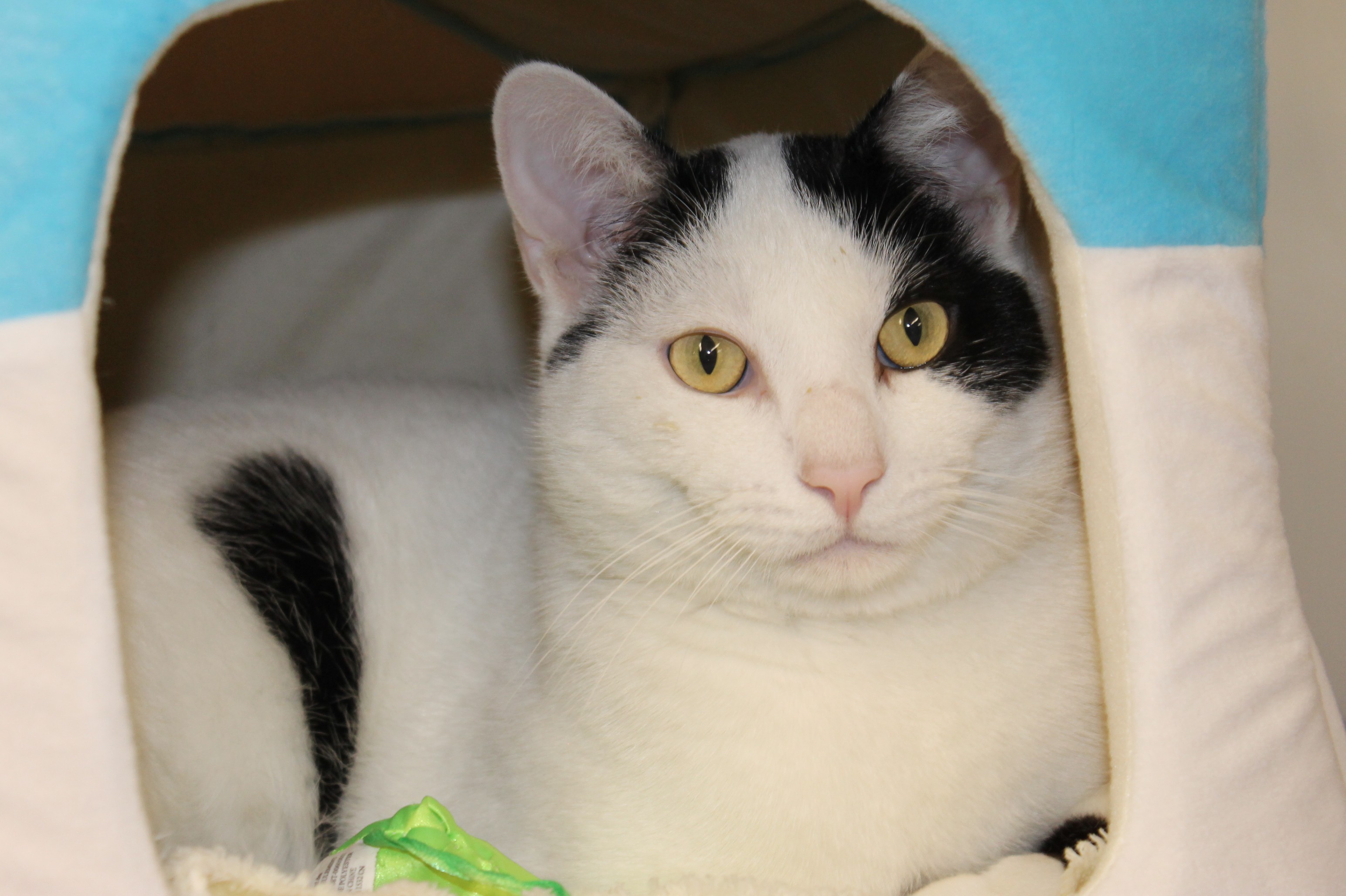Adoption Pending This handsome two year old Tuxedo is the complete package. He's talkative, outgoing, affectionate and fun. He enjoys watching the action outside windows and when he's not engaging his humans in conversation, he's showering them with nudges and purrs. He's easy going and comfortable with other cats. Please visit Oliver at our Harrison facility, you won't leave without him!