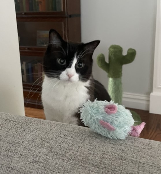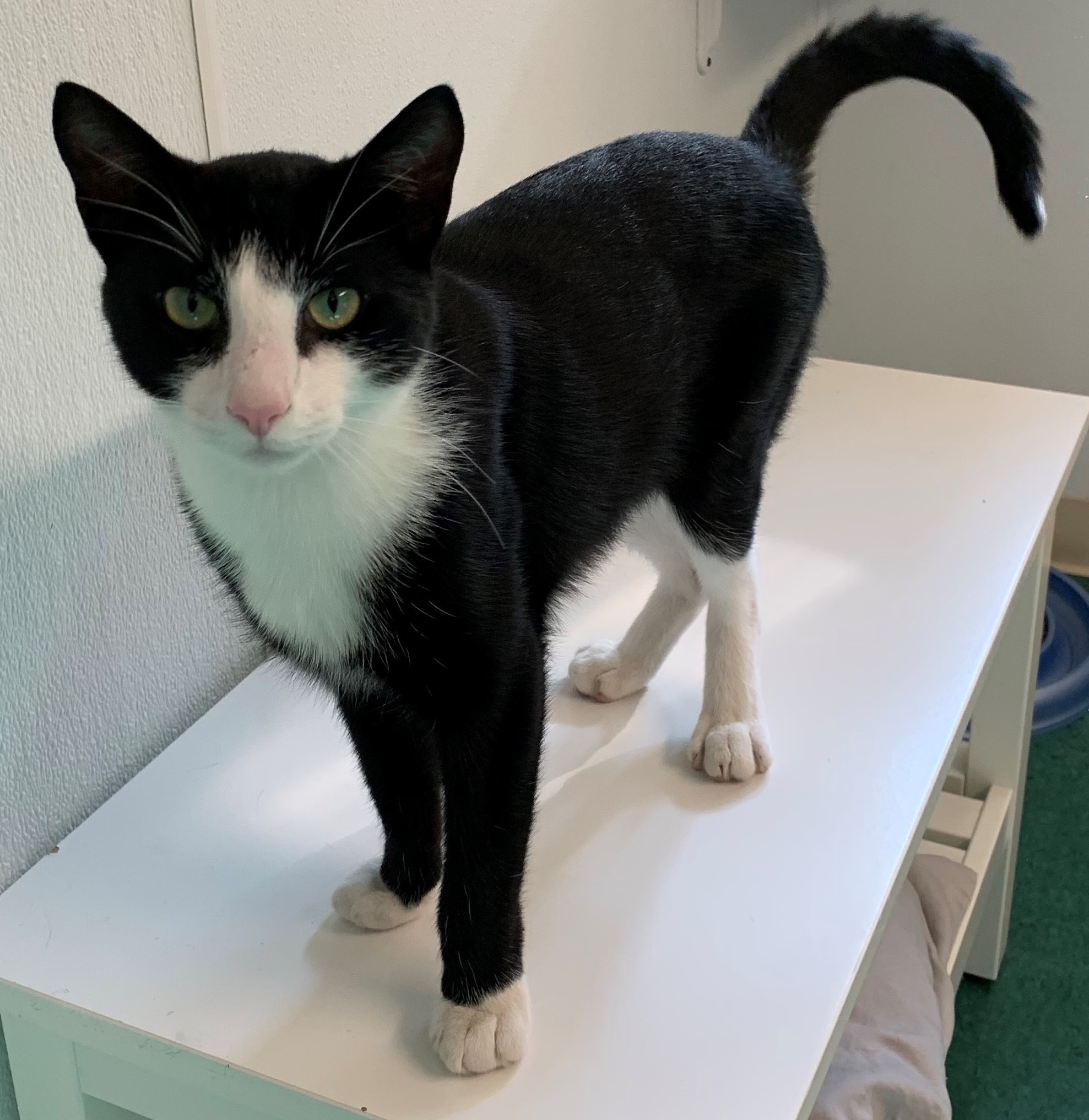Born January 2021 Oreo is a friendly boy. He comes when you call his name with his tail straight up in the air, vibrating with happiness. Oreo enjoys company, playtime and naps. He's curious and loves to explore his surroundings. A window with a view will keep him busy for hours. He's comfortable with other gentle feline friends but would be perfectly happy being the only pet in your home.