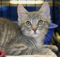 Olga is an adorable female kitten, part of the same litter as her brother, Jeffrey. She is very sweet and playful with a soft cloudy blue-gray, Russian Blue coat with blurry stripes. She lives in a foster home where she gets lots of tender loving care.
