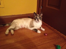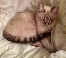 Olivia is a real beauty! A Siamese mix, about one year old, you must see her in person to realize just how lovely and precious she is (photos don't capture her beautiful appearance and unique coloring). She simply has the most gorgeous blue eyes that will melt your heart. Olivia is very friendly and cuddly. Just loves to sit on your lap and be loved. She is a true delight.