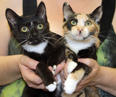 Onyx (tuxedo) and Topaz (Calico) enjoy chasing each other as their favorite pastime and playing peek a boo with mom (Sapphire). These two fur balls (born mid-March 2015) will entertain you for hours with their antics and then fall asleep cuddled together in your lap. Onyx and Topaz are looking for a home together.
