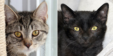 Ollie (tabby) and Otto (black) are brothers and are just as sweet as can be! They are about 6 months old, very playful and affectionate too. Otto is a little more outgoing than Ollie and will play with anything. They are little purring machines! They are very attached to each other and sleep all cuddled up with their paws wrapped around each other. We would love to find them a home together ... they will be much happier together and will keep you entertained.