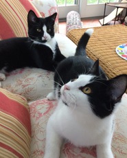 Oscar & Felix are two of the most handsome male kitties we have seen. About 5-months old (as of 10/15/17), they are lively, happy, sociable and totally engaging. We would love for them to be adopted together, but they can also be adopted separately. We also feel they will do well in a family. Oscar (with more white) is a little shyer than his sibling Felix, who is a typically mischievous kitten. Both kitties love to be petted and purr easily.