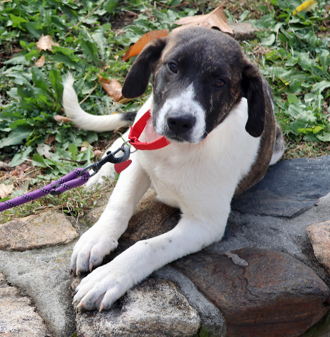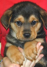This adorable pup is about 12 weeks old. He is a typical puppy -- he loves to play and cuddle. He has big paws and will probably be on the medium to large side.