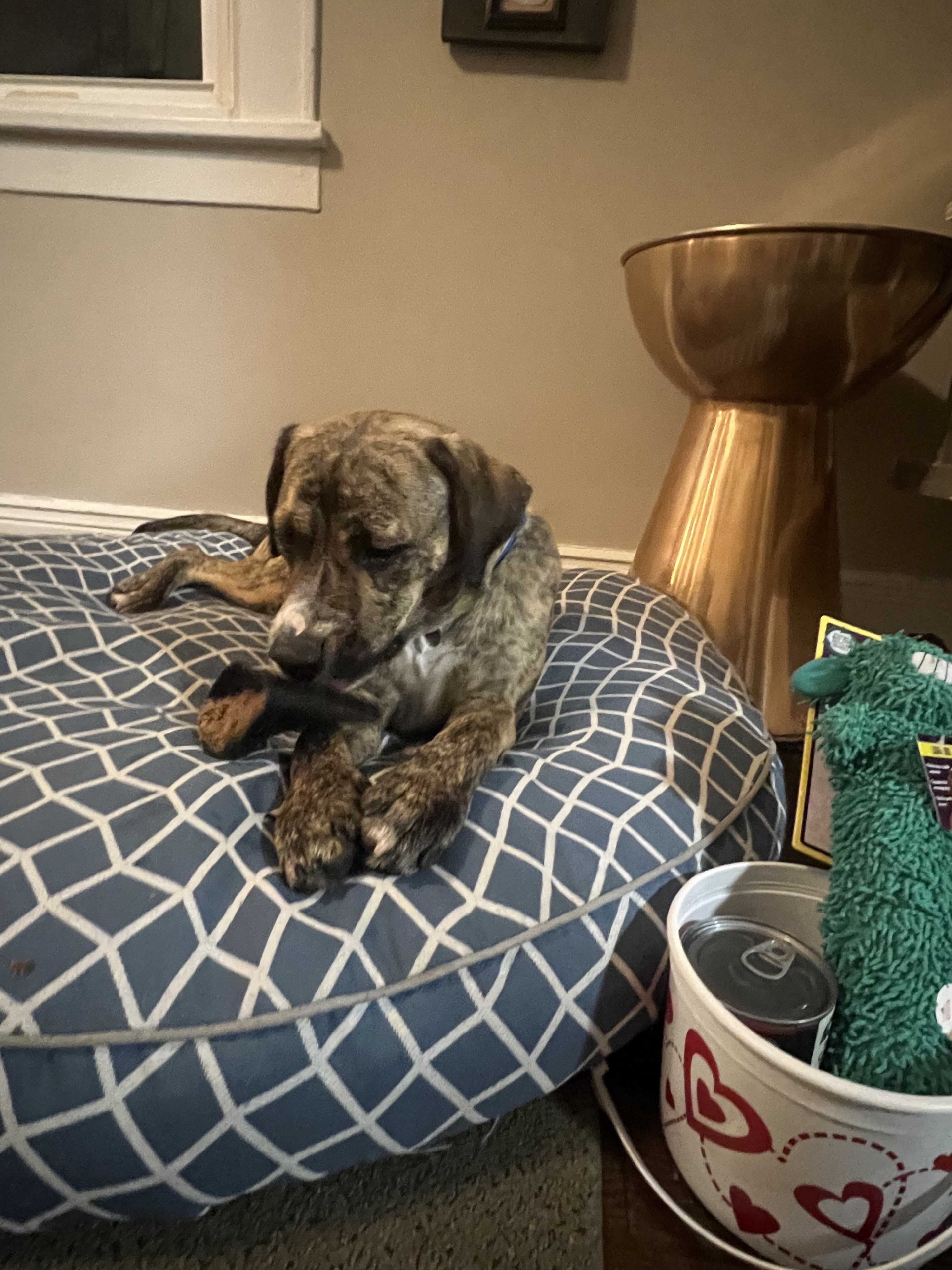 and loves his dog pillow in a favorite, quiet spot. He enjoys riding in