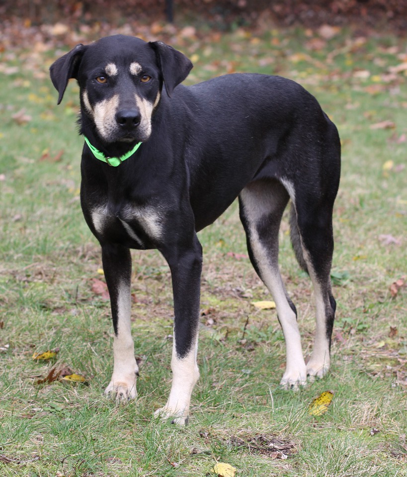 is a very handsome boy who seems to be on the calm side for such a young dog. He is very affectionate and loves to play with you too. He is shy and quiet in new situations. He is around 53 lbs and 1 1/2 years old. He is great with other dogs and loves all people. He likes to squeeze between your legs for comfort.