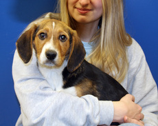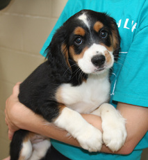 Otis, a male beagle/cavalier king charles spaniel mix weighs 15 lbs. and is a real sugar puss. He is about 3 months old. You can always count on Otis to initiate a lot of the play with his siblings whether it be stalking and jumping out at them, wrestling or chasing for he is content doing almost anything. A favorite for belly rubs and just plopping down when you pet him, Otis is beside himself when he hears a squeak toy and loves running around chasing the sound. Very alert to his surroundings and the first to pay attention when you call, Otis will always remember that you are there to love him which you can see by his high speed wagging tail. Though he has a wonderful temperament and gets along well with his foster family's four dogs, because of his puppy exuberance which can be a little overwhelming for young children he should not be with a family with children under the age of 8. Otis is crate trained, sleeps through the night and will probably be a large sized dog. Now, wouldn't you just love to have Otis hiding around the corner and pouncing to initiate his play with you? (Otis is one of Letti's pups and brother to Oliver, Odie and Oscar).