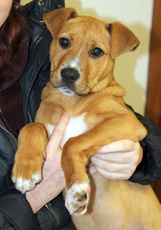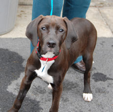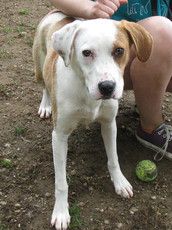 This sweet pointer mix is 5 months old and 20 lbs. Olive loves to run and wrestle with the other dogs in her foster home. She travels well in the car and is working on her housebreaking. Olive is still a bouncy puppy who likes to jump up to deliver lots of kisses so young children would not be the best match for this energetic girl. She has the softest velvety fur!